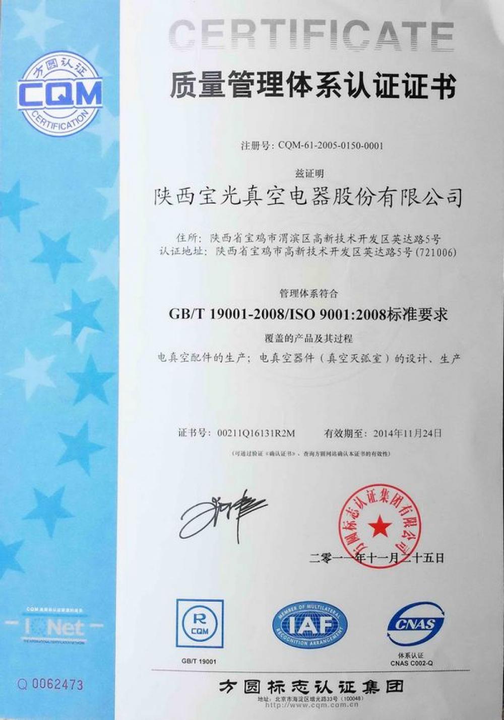 In 2011, Shaanxi Baoguang obtained ISO 9001:2008 Quality Management System certificate.
