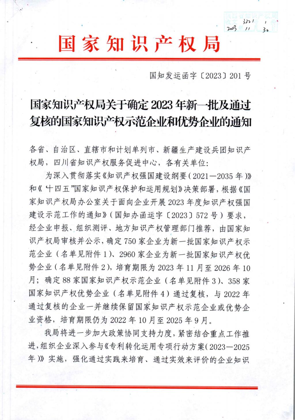 - 2023年榮獲國家知識產權示範企業和優勢企業