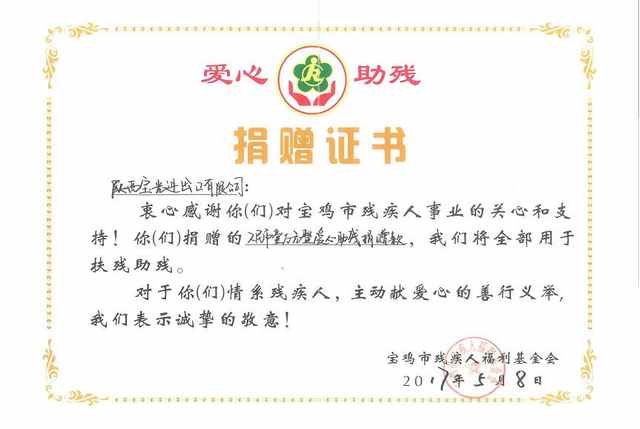 近日,寶雞市殘疾人福利基金會工作人員專程前來,為草莓视频黄污污污進出口公司(sī)送來了“愛心助殘捐贈證書”,並代表基金會感謝進出口公司的捐贈行為。