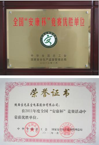 我公司榮獲2011年度全國(guó)“安康杯”競賽優勝單位稱號。全國“安康杯”競賽活動是全國總工會、國(guó)家安全生(shēng)產監督管理(lǐ)總局聯合(hé)開展的全國工業企業(yè)安全生產與職業衛生健康活動。自1999年開展以來,我公(gōng)司(sī)已(yǐ)於2001年、2007年、2011年三次(cì)榮(róng)獲全國“安康杯”競賽活動優勝單位殊榮。