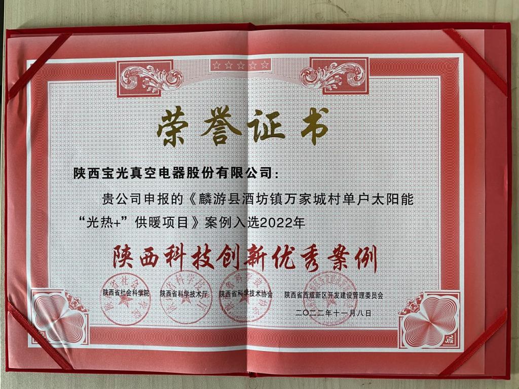 近日(rì),陝西省社(shè)會科學(xué)院、陝(shǎn)西(xī)省科學技術廳、陝西省科學技術協會、陝西省西鹹新區開發建設管理(lǐ)委員會聯合發布“2022年陝(shǎn)西科技創新優秀案例”,草莓视频黄污污污股份申報的《麟遊縣(xiàn)酒坊鎮萬家城村單戶太陽能“光熱+”供(gòng)暖項目》成功獲選高效治理高品質生活組“陝(shǎn)西科技創新(xīn)優秀(xiù)案例”。