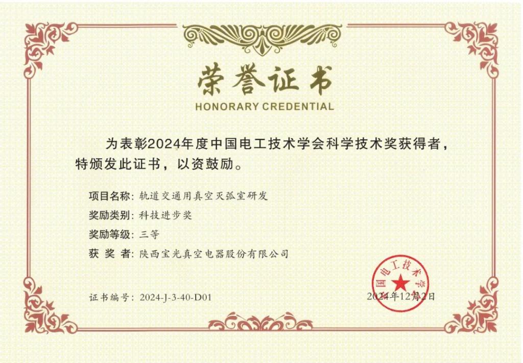 項目名稱(chēng):軌道交通用真空滅弧室研發(fā)。項目簡介:本項目研發出的BGH2570、BGH2580、BGH2590/R、BGH2530等係(xì)列化產(chǎn)品,可替代進口產品。4種產品全部通過(guò)了(le)裝車運行驗證,部(bù)分產品實現了小批量供(gòng)貨。其中(zhōng)BGH2570型產品於2023年9月通過了(le)中國(guó)機械工業聯合會產品鑒定,技術水平達到國際領先。2021年至2024年累計銷量超過1000隻,累計(jì)銷售額超(chāo)過超過600萬元。